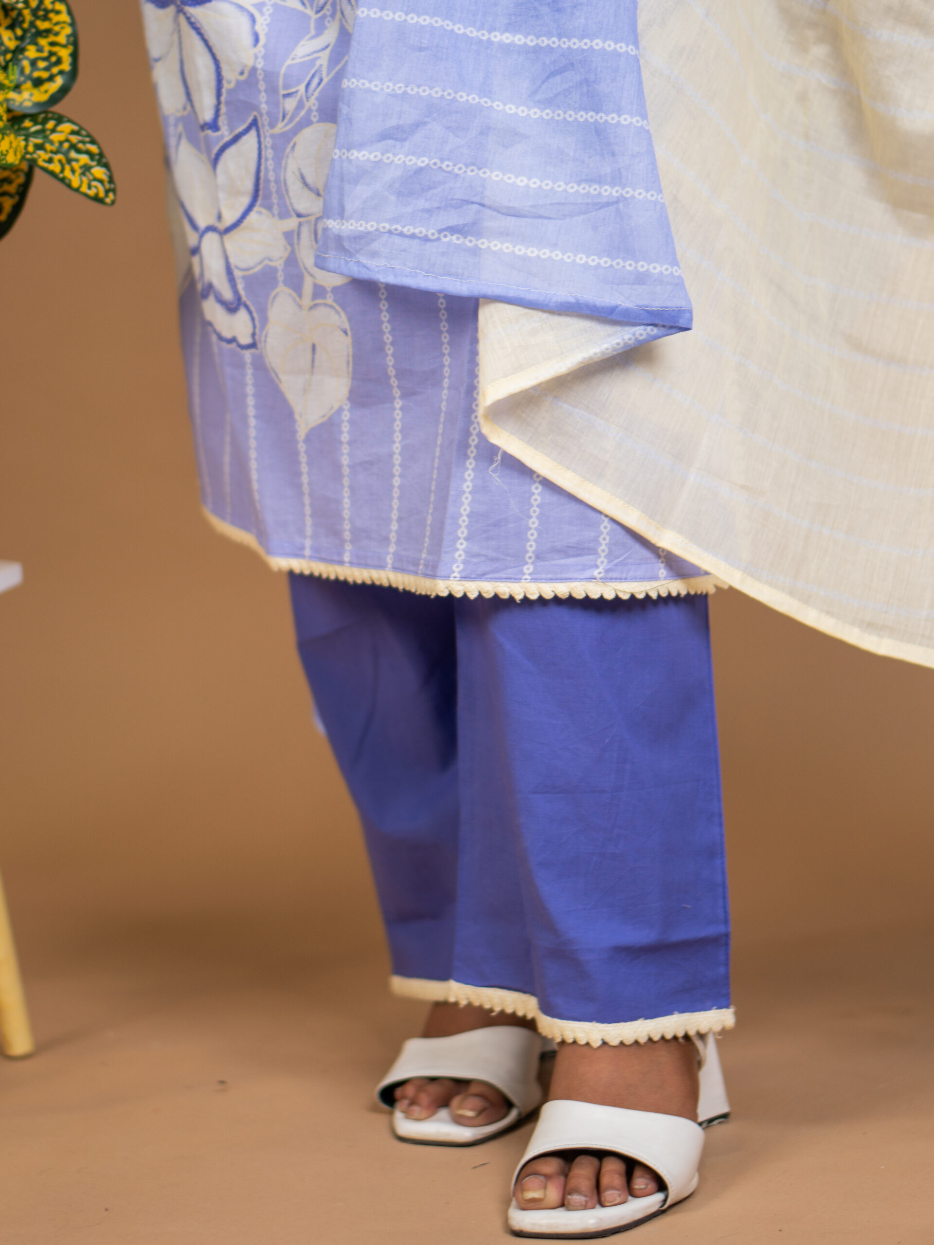 Set Includes: Kurta, solid blue pants, and matching printed dupatta