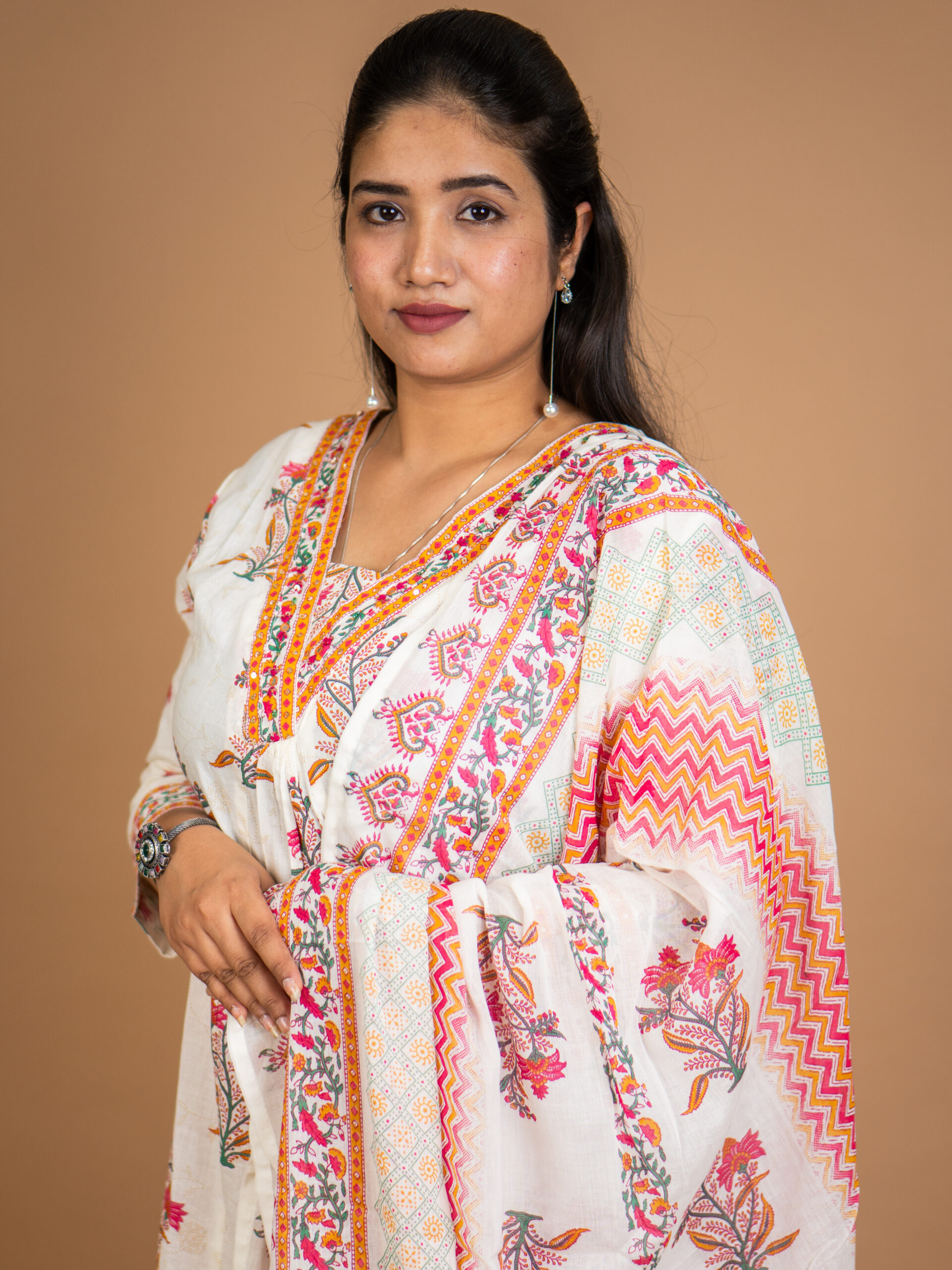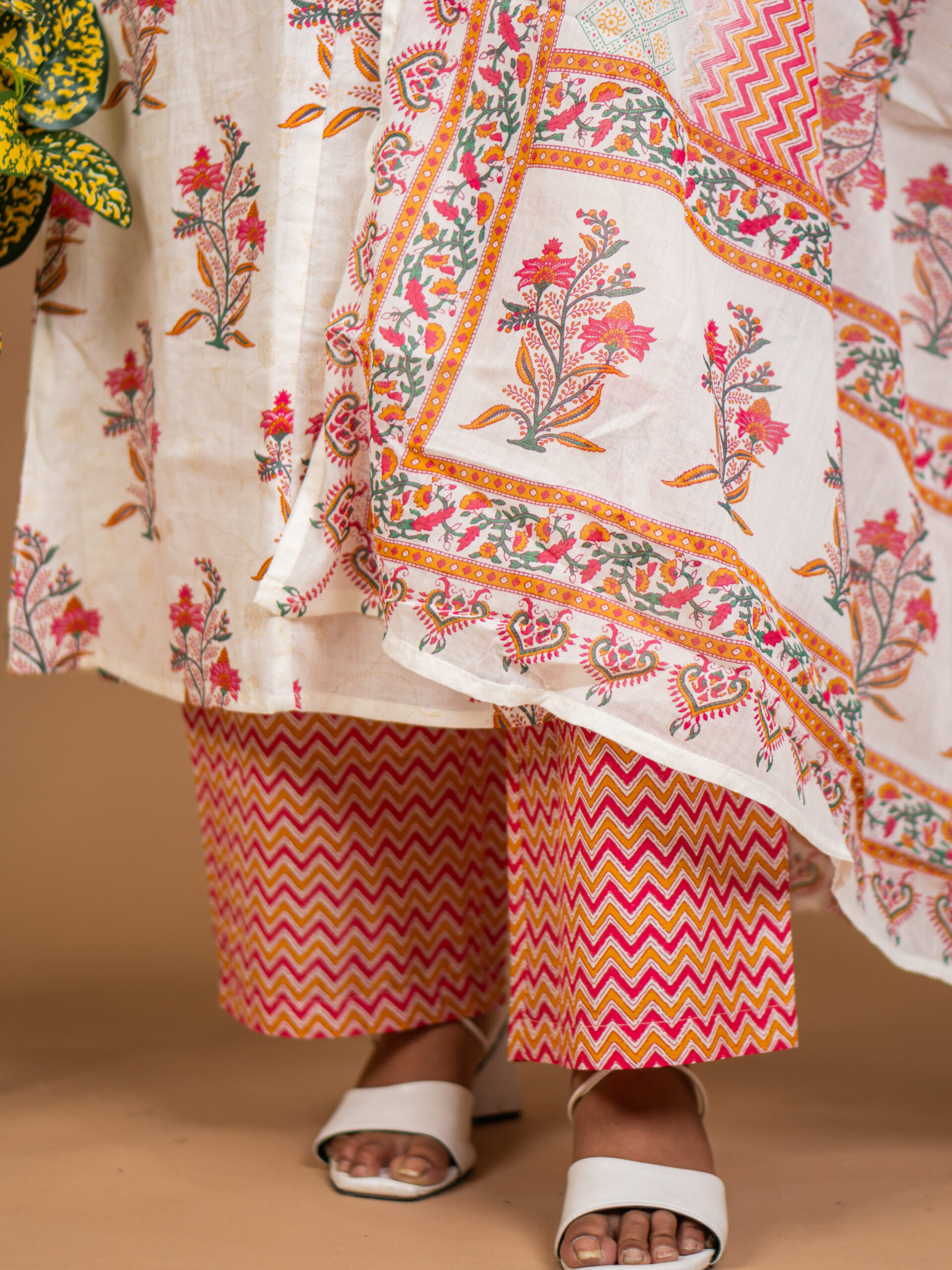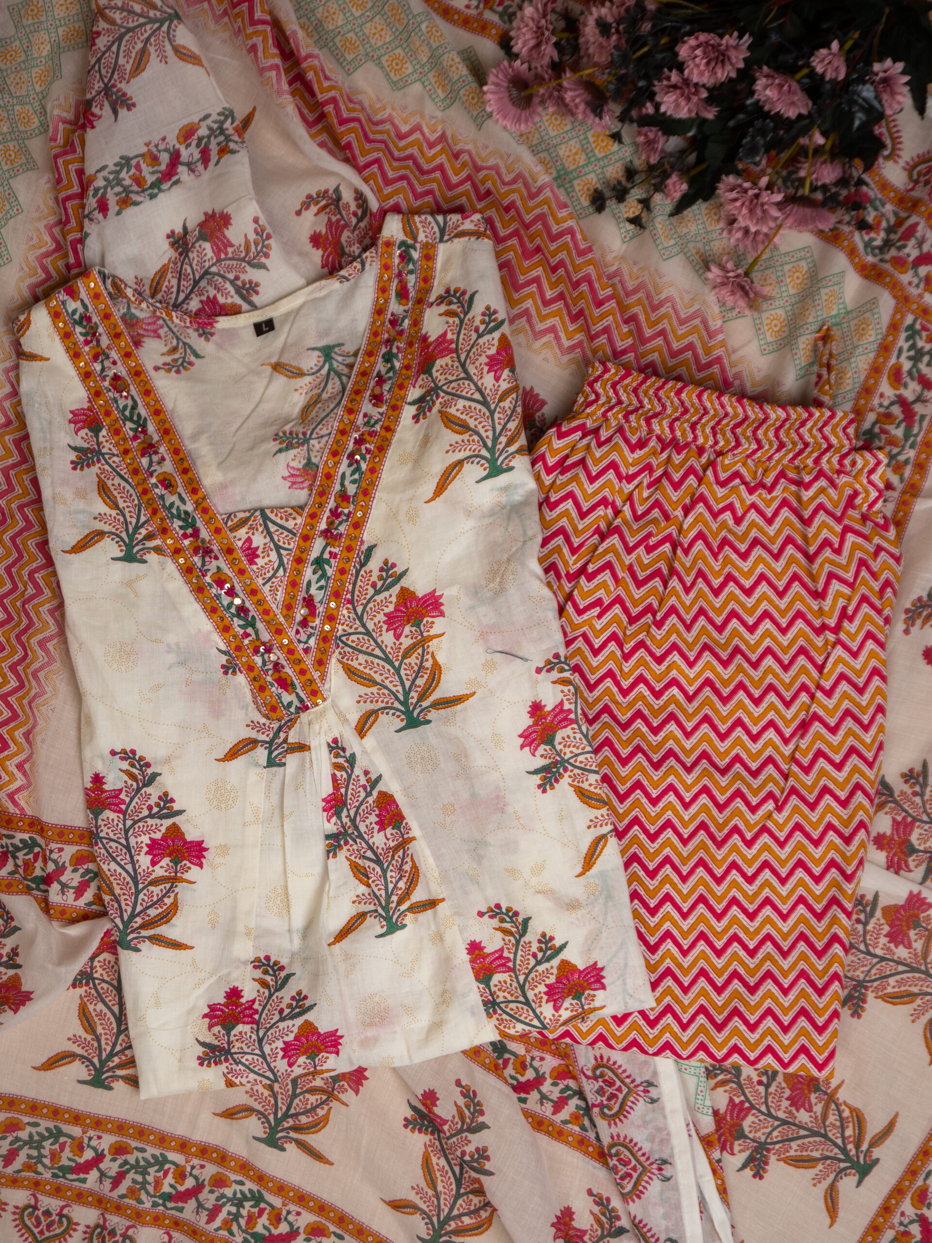 • Pattern: Ethnic floral prints on kurta and dupatta, geometric chevron design on pants, ornate multi-color borders