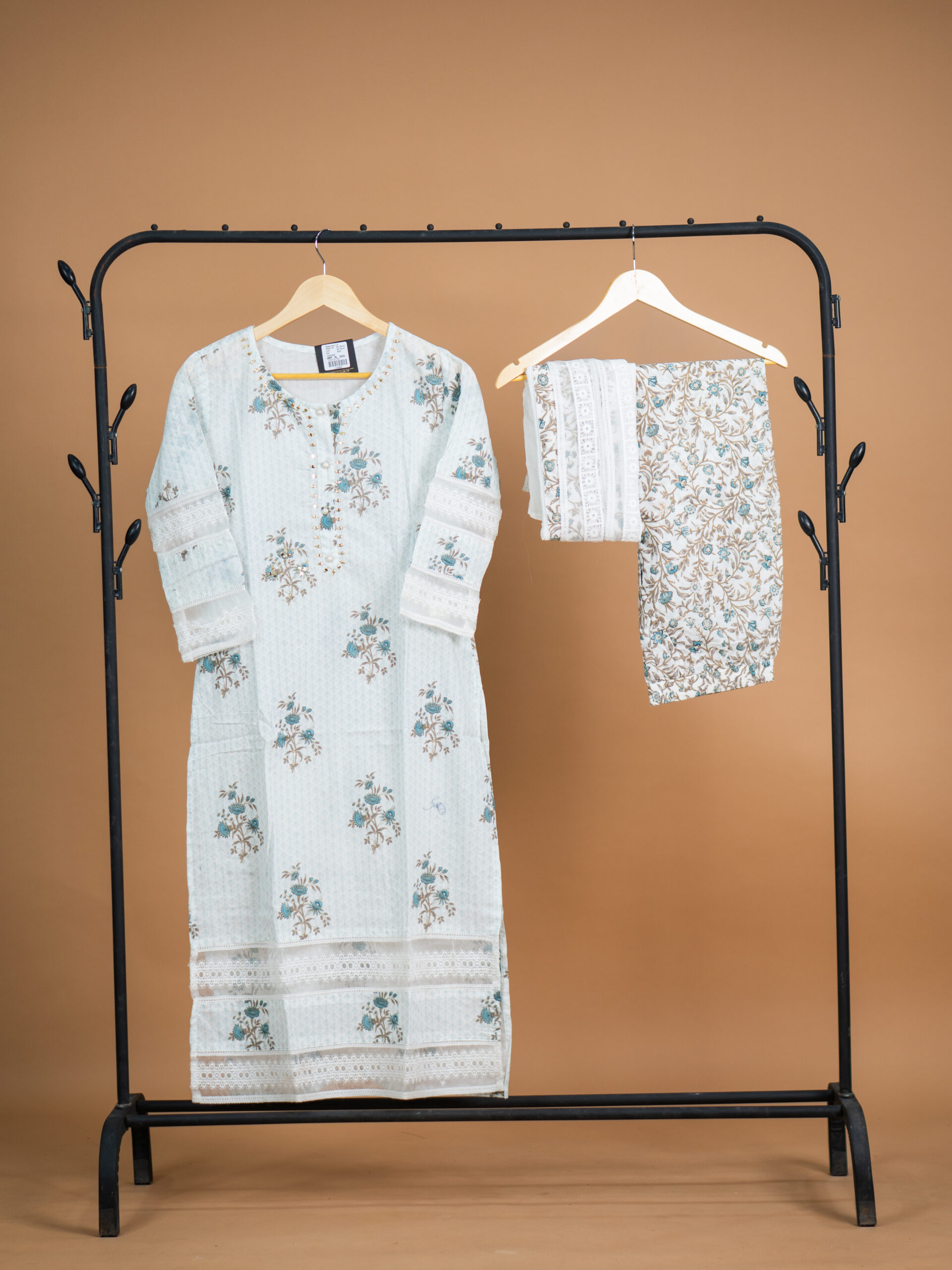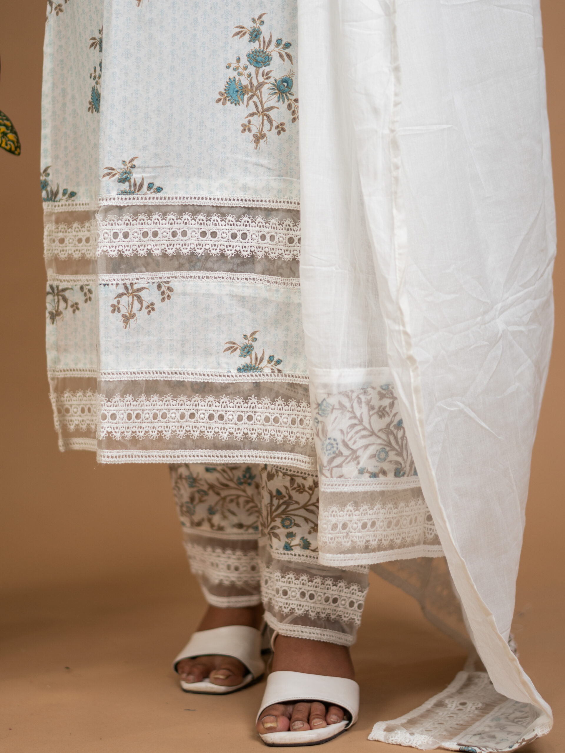 • Pattern: Floral prints on kurta and pants, delicate lacework and detailed border accents on hem and sleeves