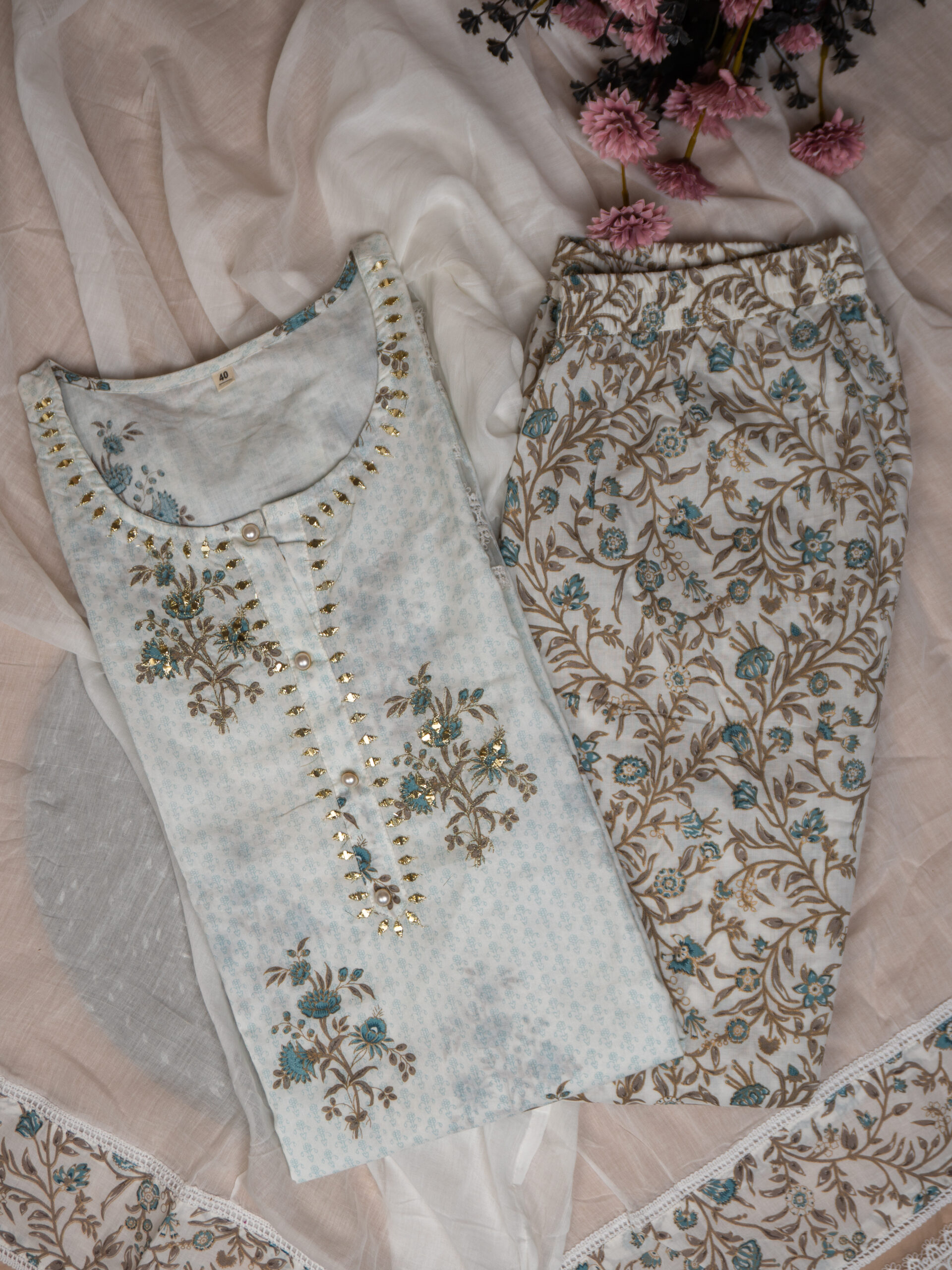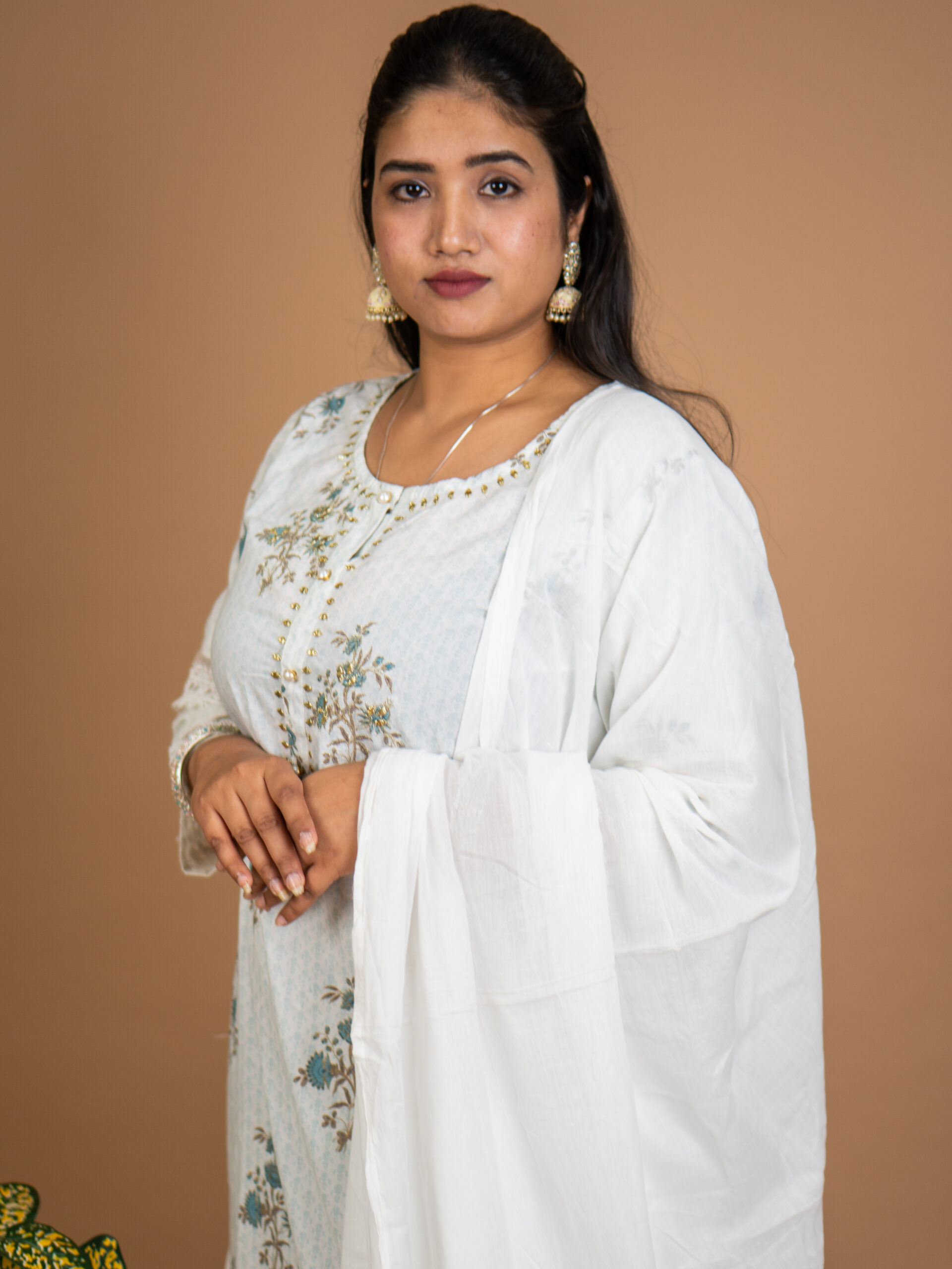 • Set Includes: Printed kurta, matching pants, and a solid ivory dupatta with subtle border work