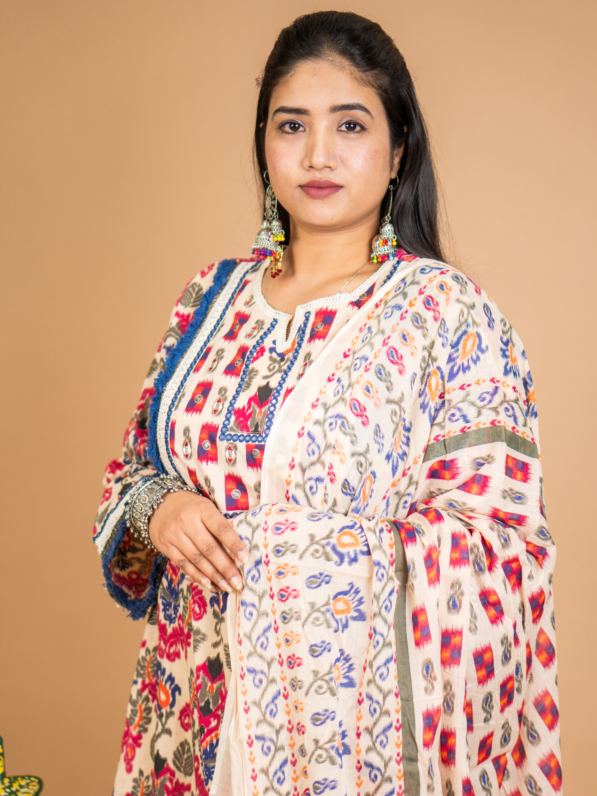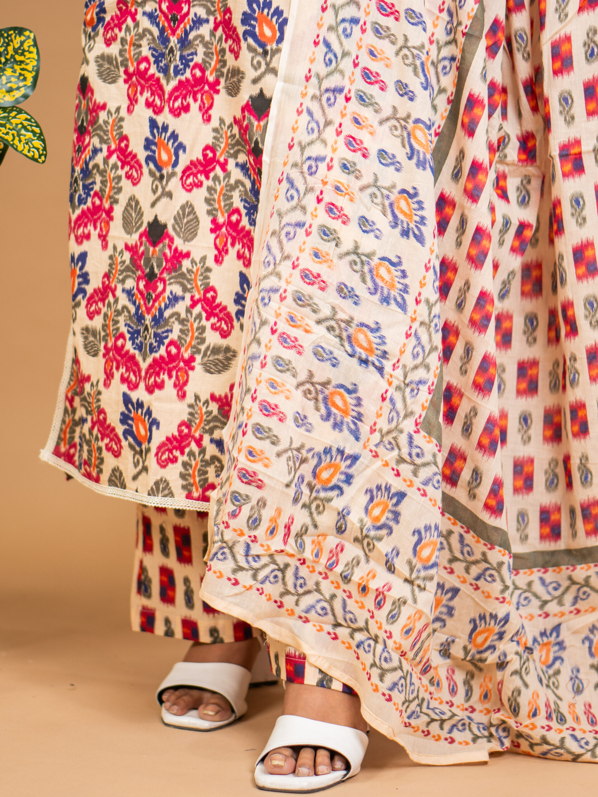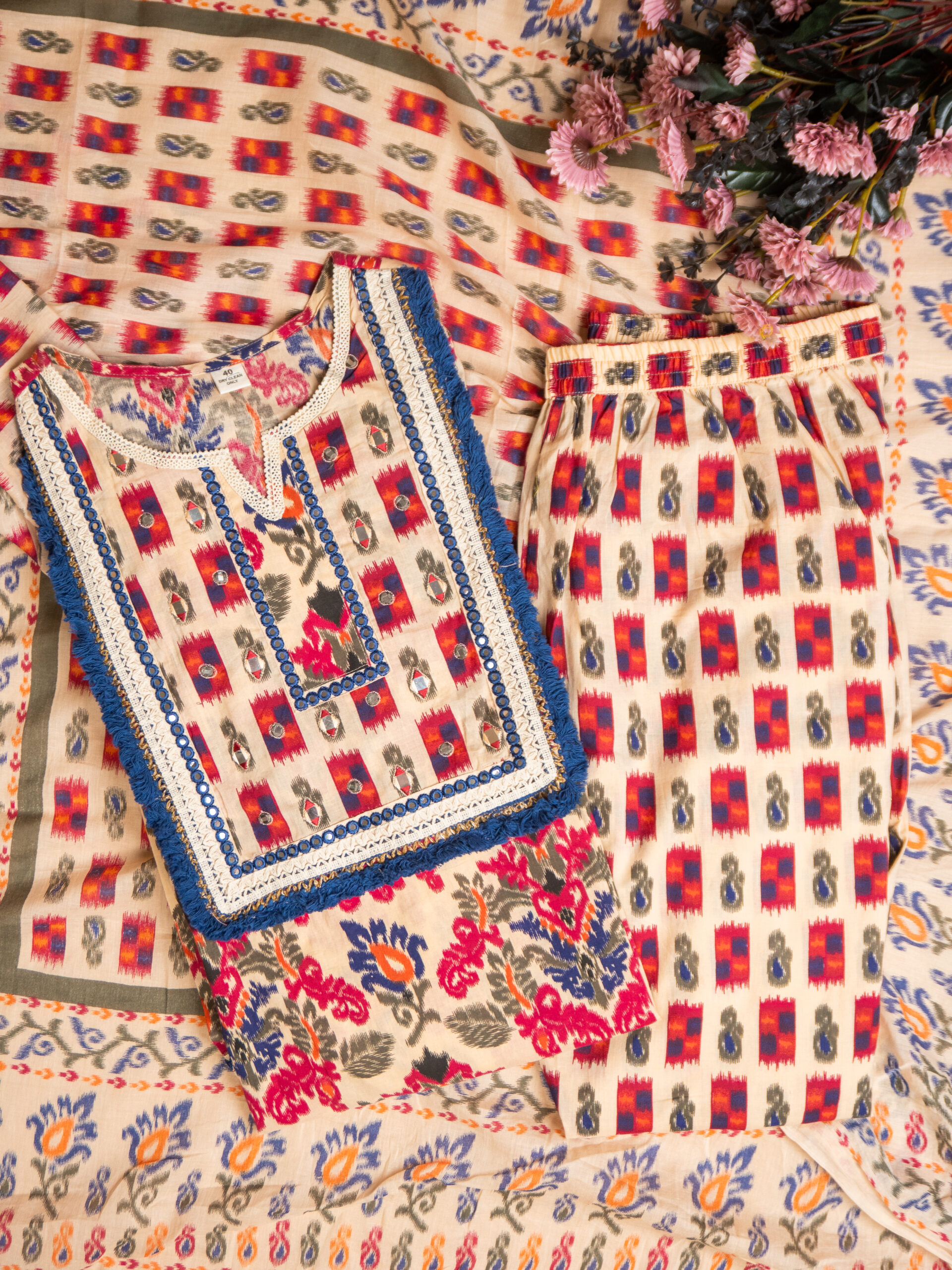 • Set Includes: Printed kurta, printed pants, and a matching printed dupatta