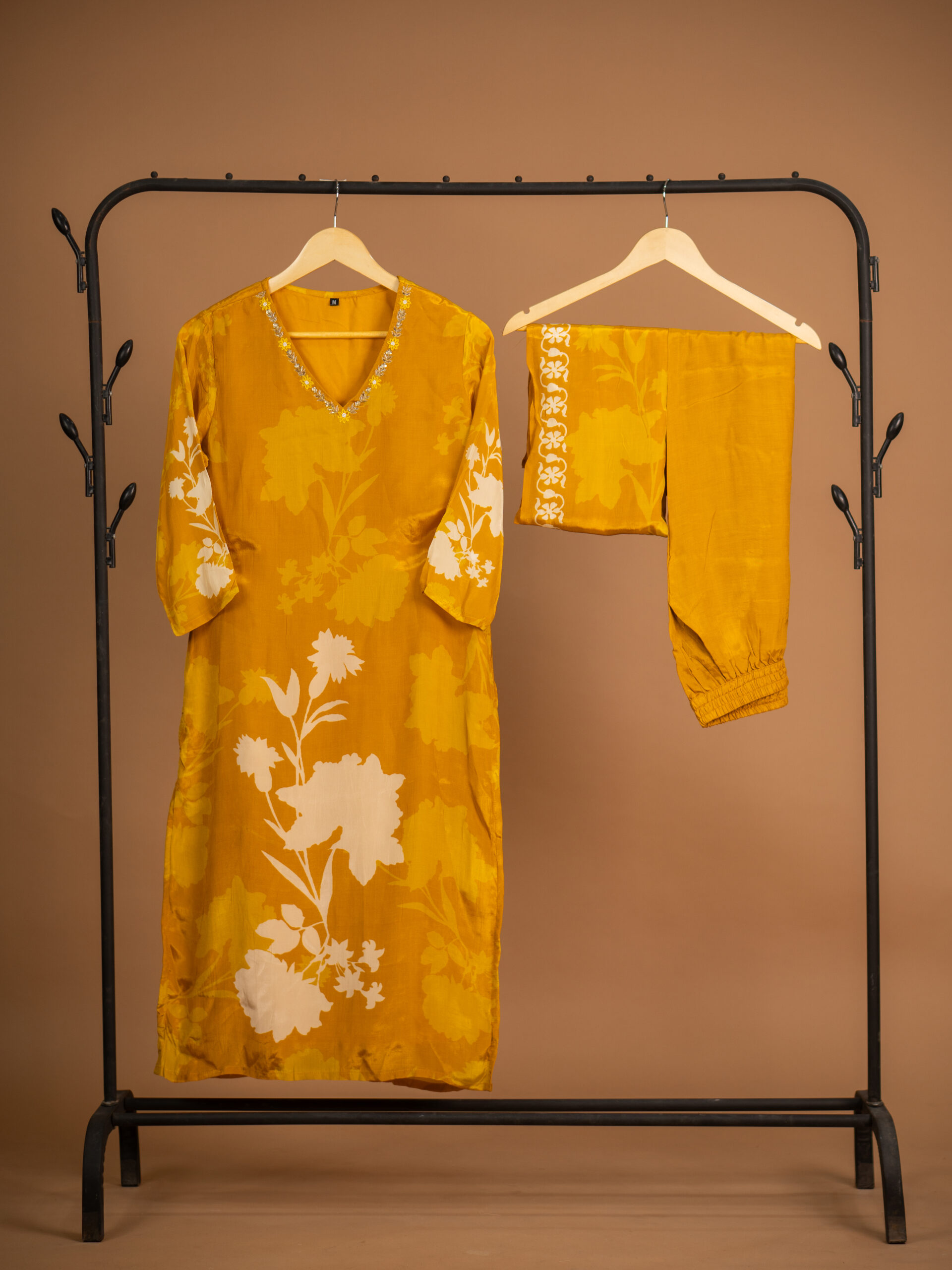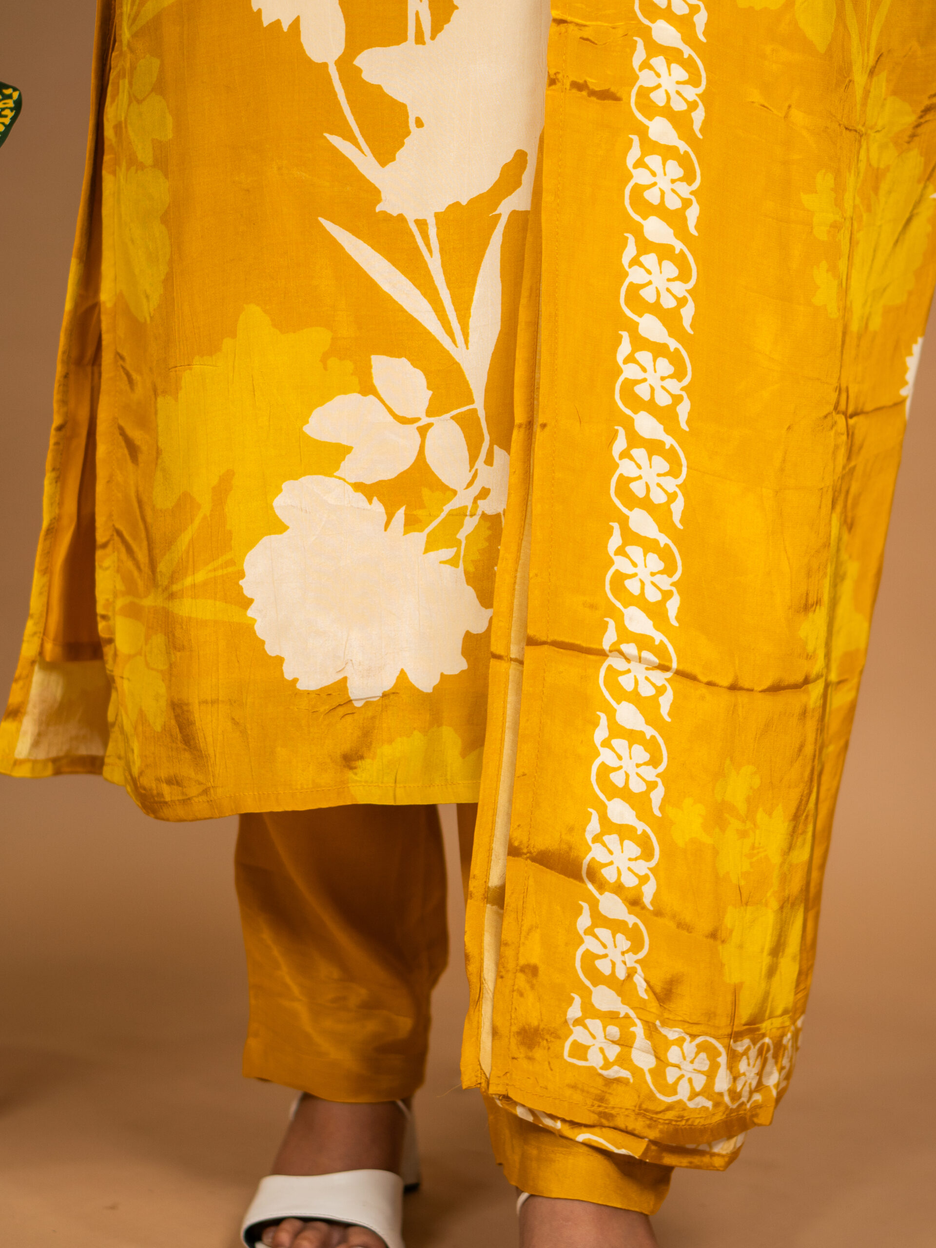 Color: Mustard yellow with white floral motifs