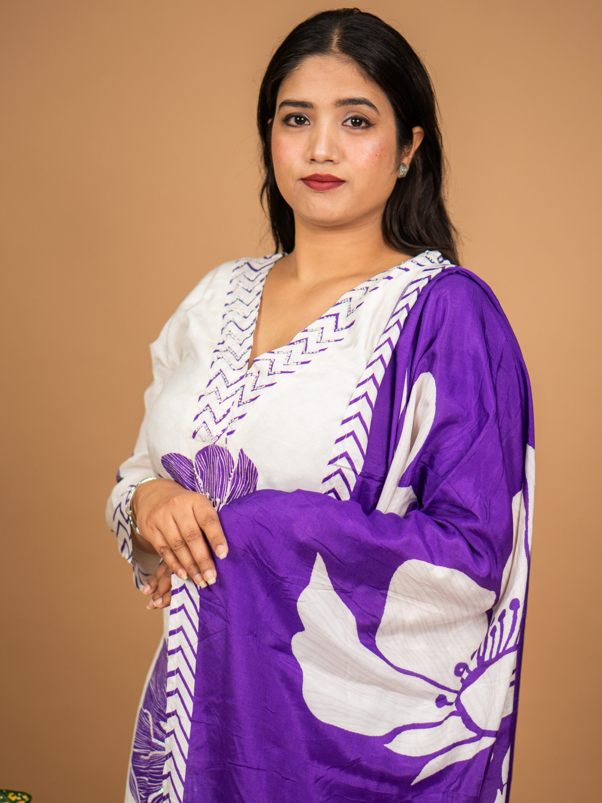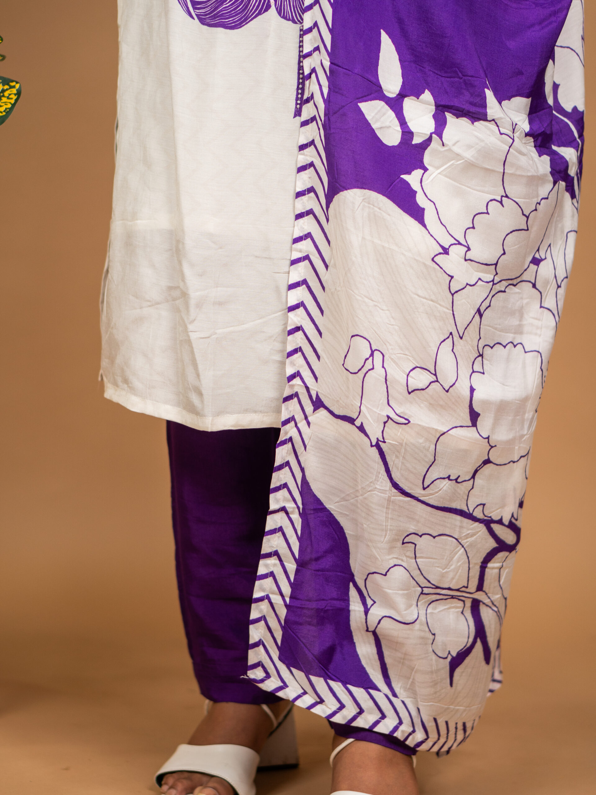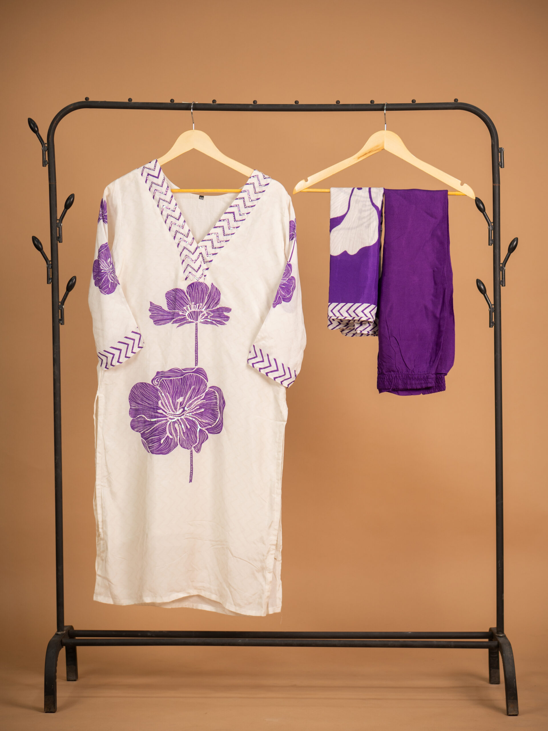 Kurta: Off-white with bold purple floral motifs, V-neck with printed chevron border, and 3/4th sleeves for a modern appeal