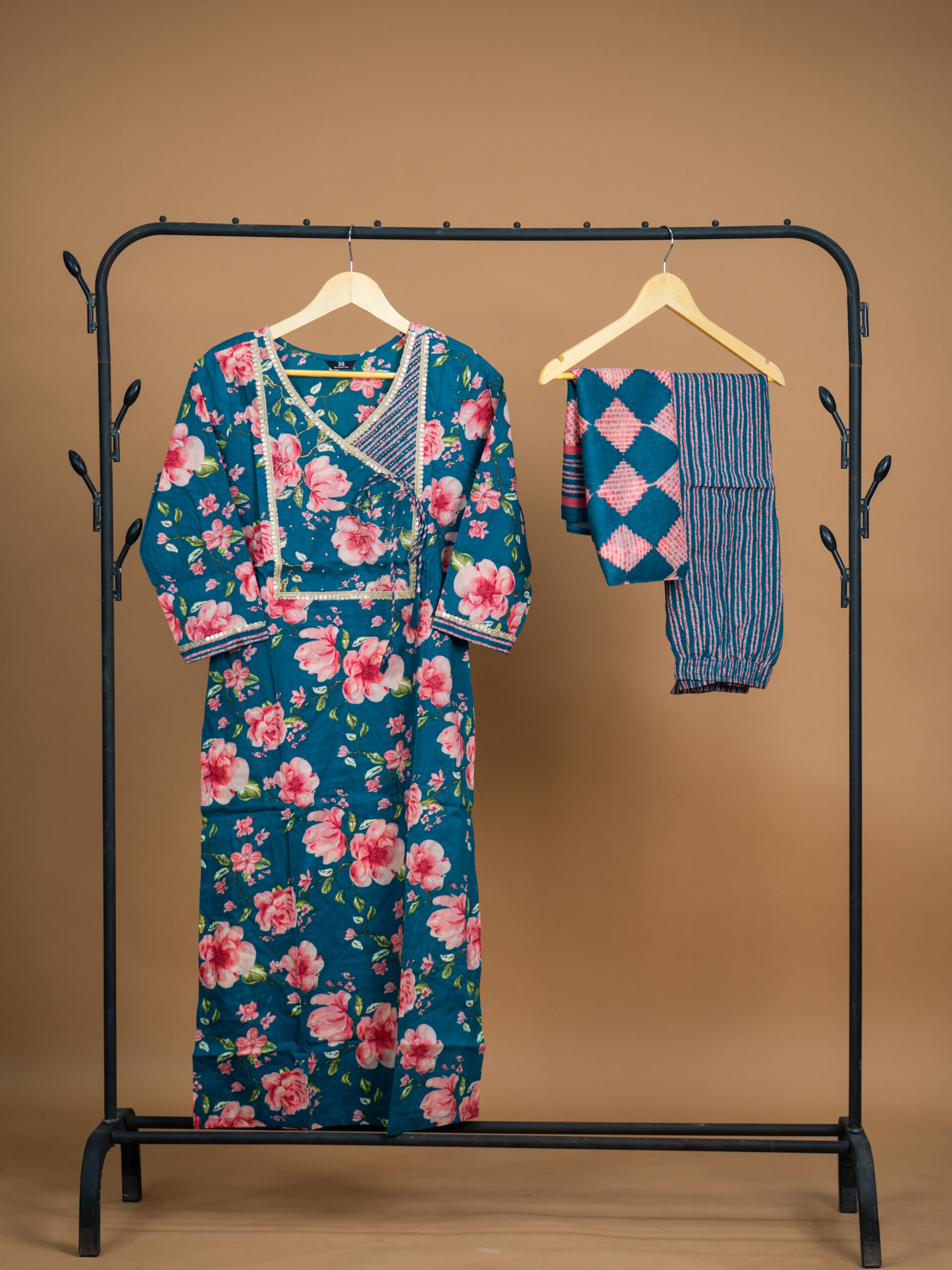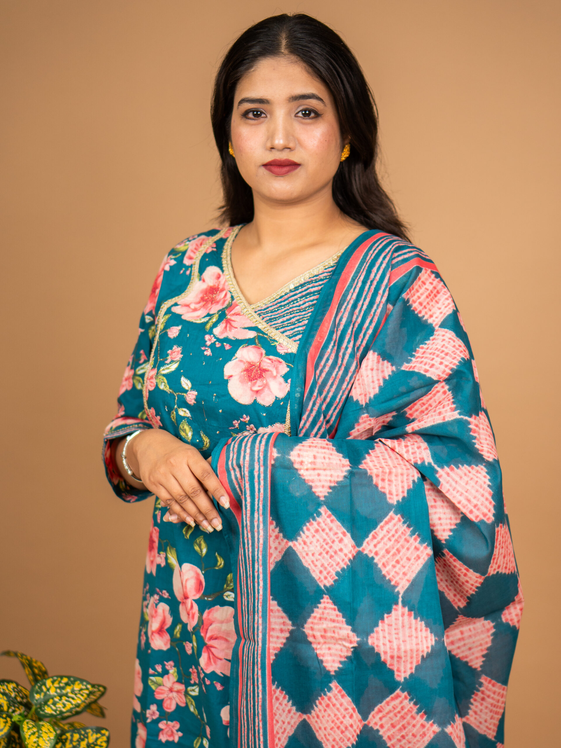 • Pattern: Large pink floral print on the kurta, striped pants, and geometric diamonds on the matching dupatta