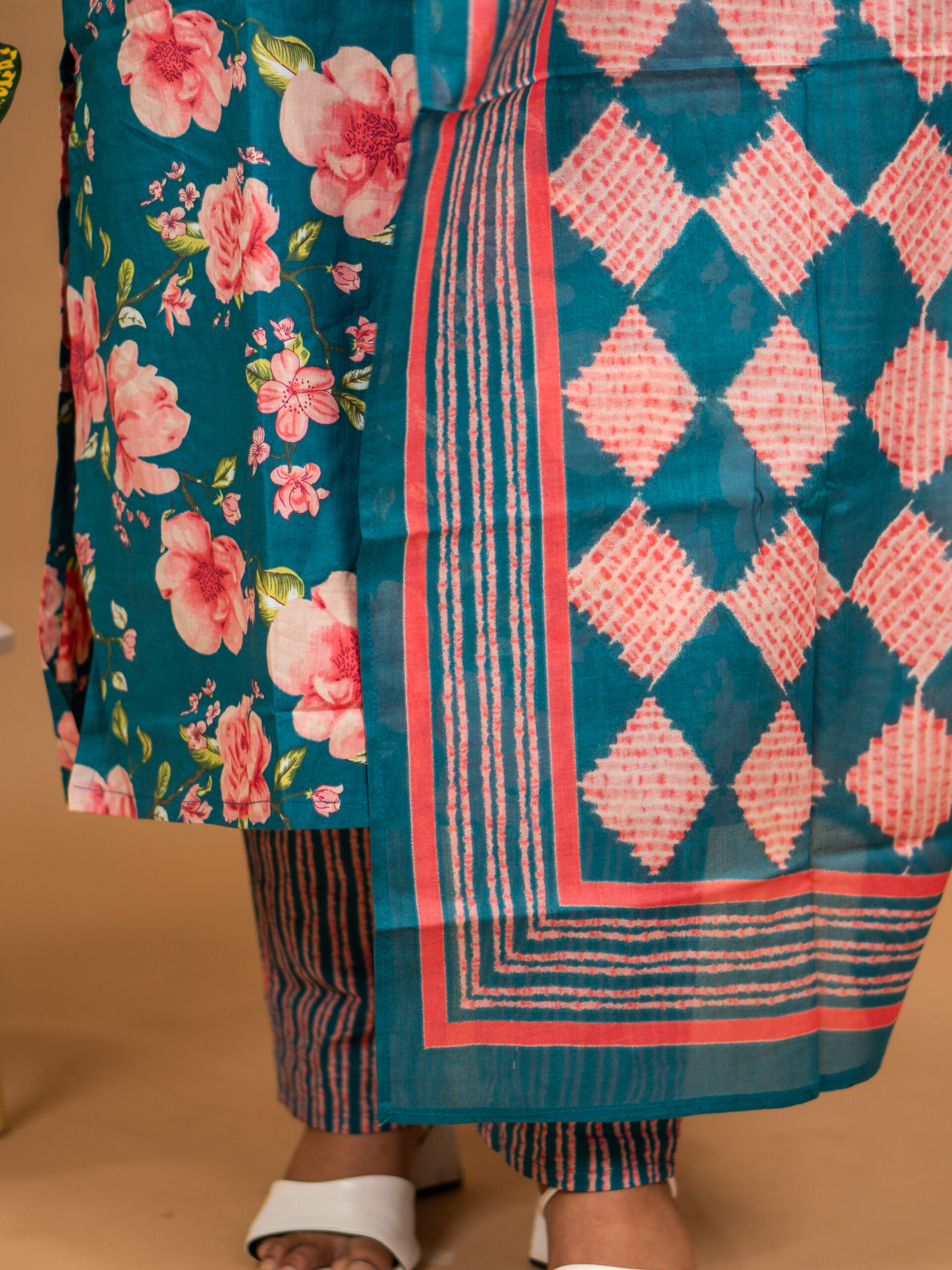 • Color: Teal base with pink floral motifs and striped accents